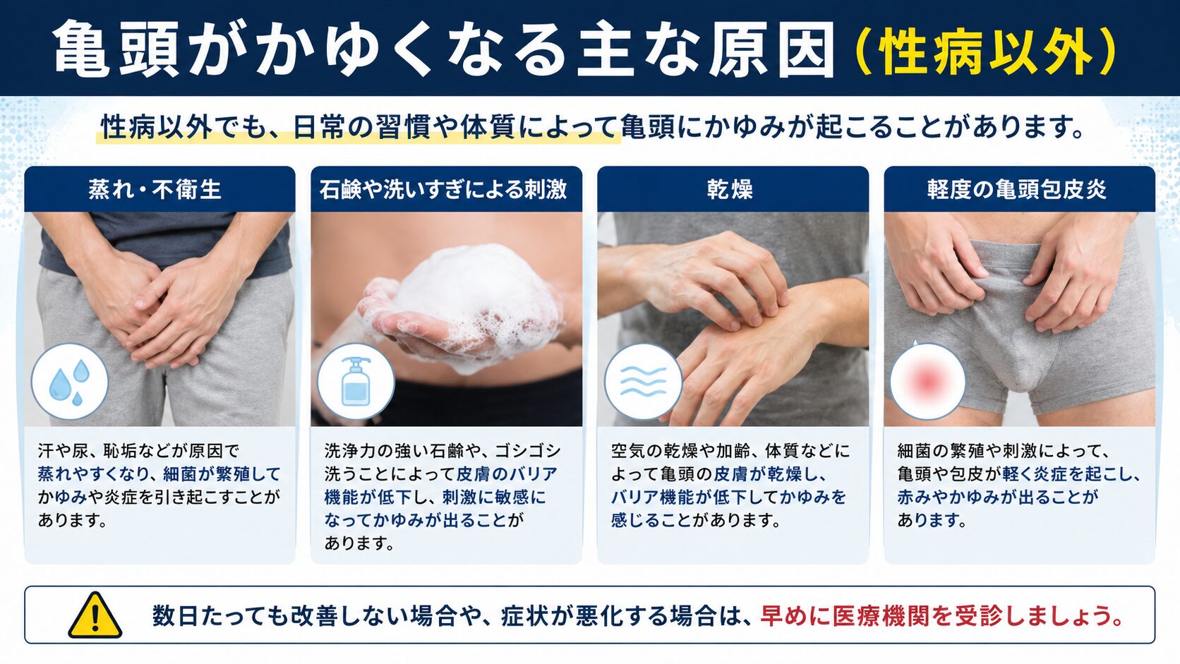 亀頭のかゆみは、軽い炎症から性病までさまざまな原因があります。