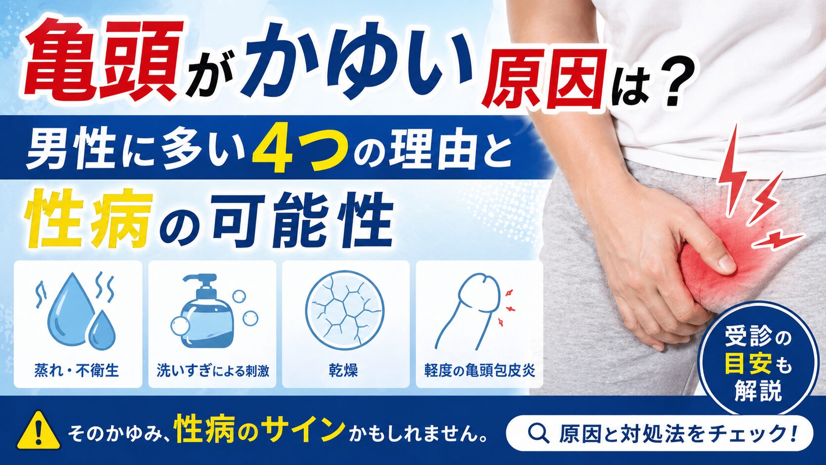 亀頭のかゆみは、蒸れや摩擦、洗いすぎなどの一時的な刺激で起こることもありますが、カンジダ性亀頭包皮炎や細菌感染、クラミジア・淋菌などの性感染症が関係している場合もあります。特に、かゆみだけでなく赤み、ただれ、白いカス、痛み、排尿時の違和感、尿道からの分泌物がある場合は、自己判断で様子を見続けるのは注意が必要です。
