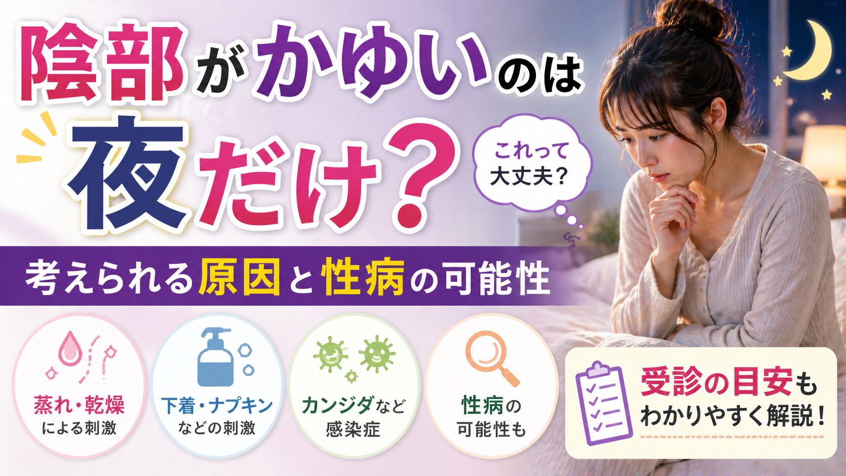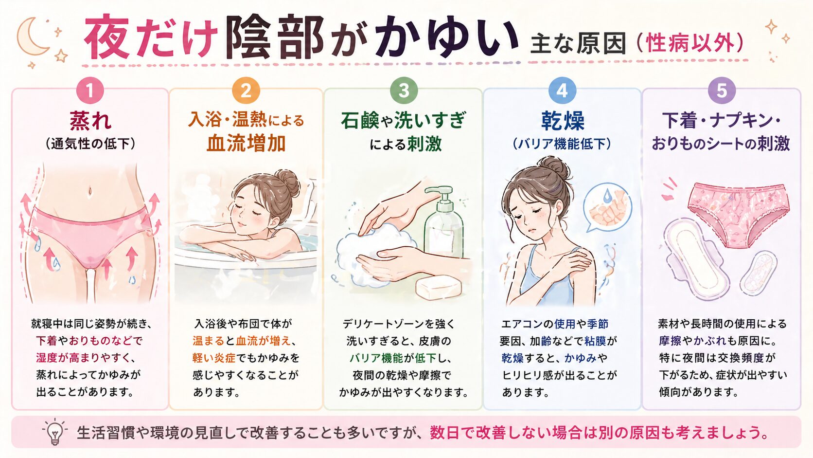 陰部の皮膚や粘膜が乾燥すると、外部からの刺激に弱くなり、かゆみを感じやすくなります。洗いすぎ、加齢、ホルモン変化、入浴後の乾燥、下着との摩擦などがきっかけになることがあります。日中は軽い違和感程度でも、夜に布団の中で体が温まると、乾燥によるチクチクしたかゆみが強く感じられる場合があります。