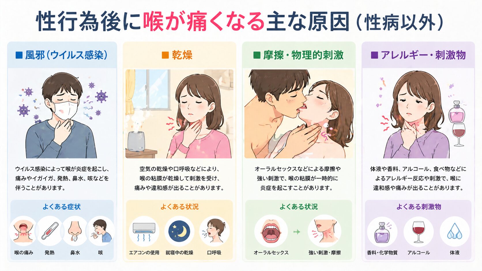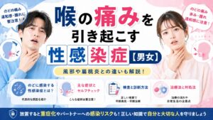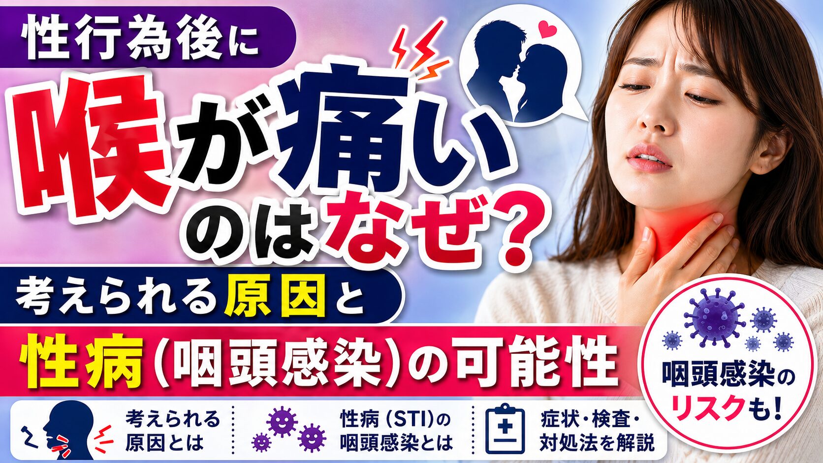 性行為後の喉の痛みは、風邪などの軽い原因のこともあれば咽頭の性感染症が原因の場合もあります。