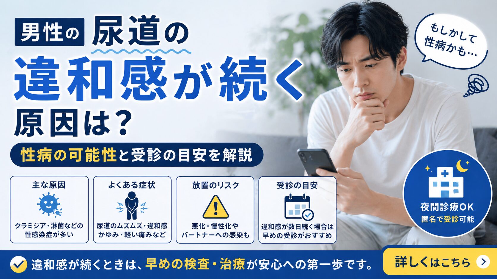 尿道の違和感がある場合、「もう少し様子を見よう」と考えてしまいがちですが、症状が出ている時点で検査の対象になります。特に性感染症は初期症状が軽いことも多く、放置しても自然に改善しないケースがほとんどです。