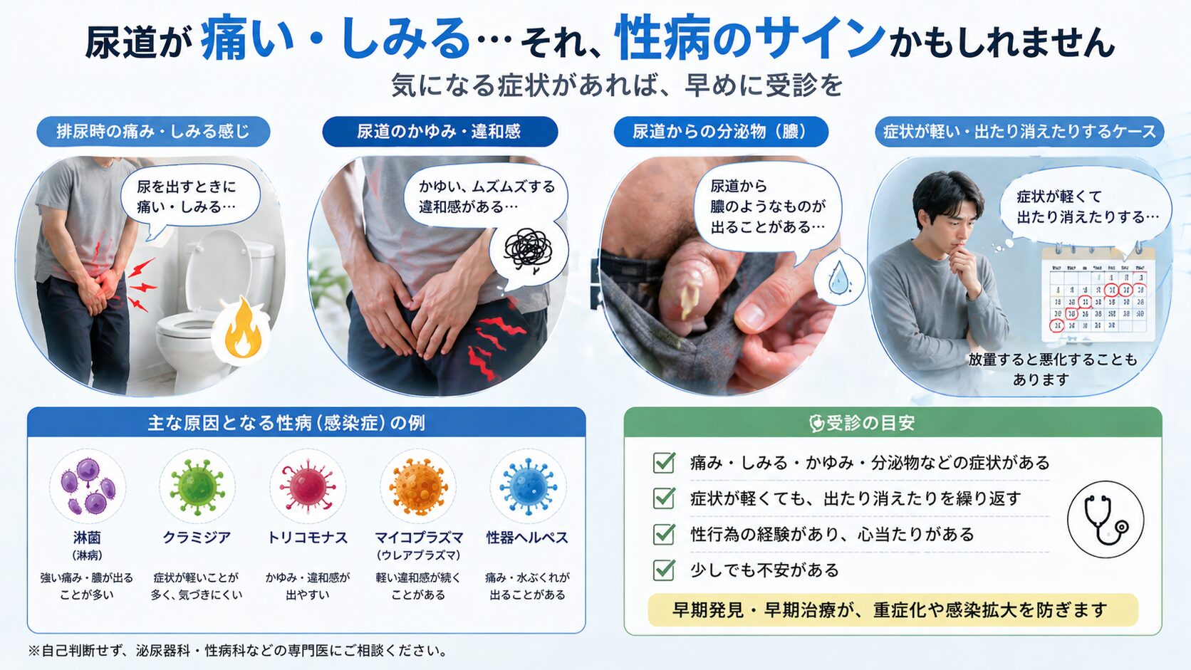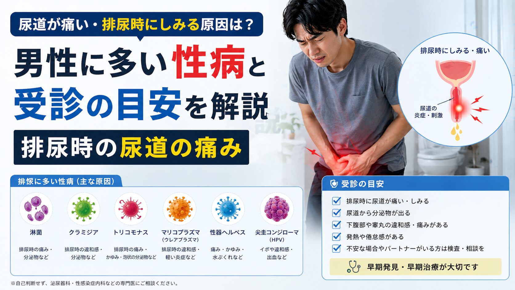 尿道の痛みやしみる症状は、クラミジアや淋菌など性病の可能性があります。軽症でも放置せず、早めの検査・受診で早期発見と感染拡大の予防が重要です。