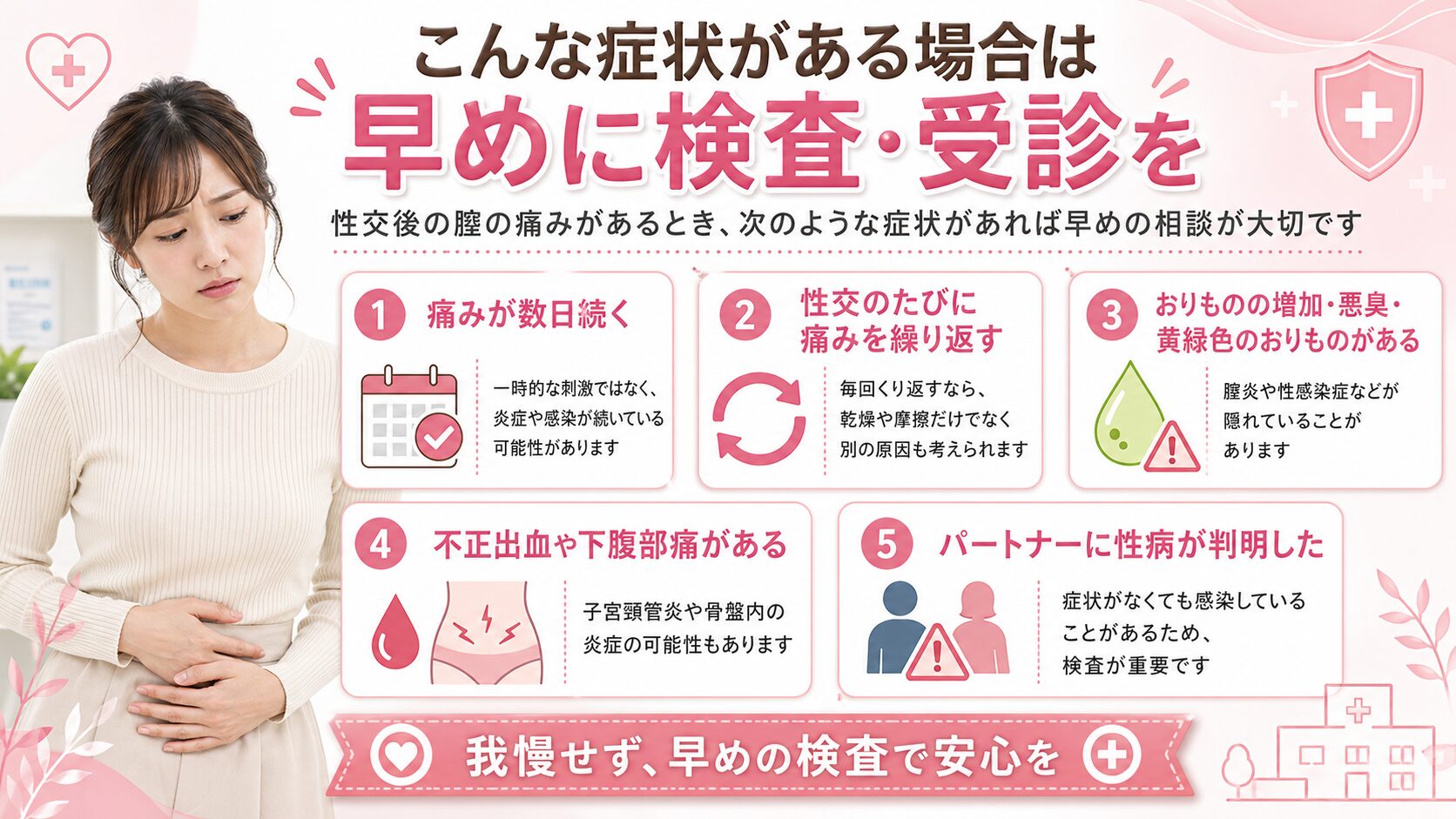 - 性交後の痛みが一時的に見えても、数日続く場合や下腹部の違和感を伴う場合は、性感染症が隠れていることがあります