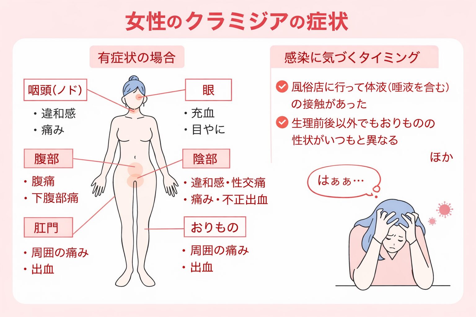 感染部位によって症状は異なり、性器に感染した場合、男性ではクラミジア性尿道炎、女性ではクラミジア性子宮頸管炎を引き起こします。また、のどに感染すると咽頭(上咽頭)炎を起こすこともあります。