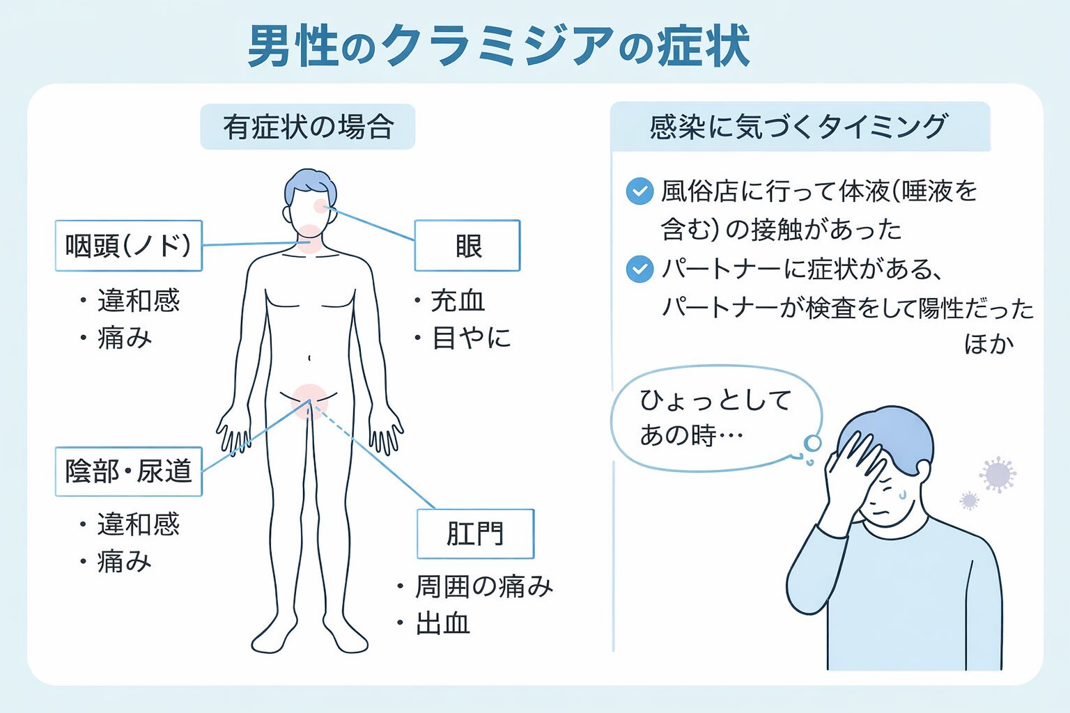 男性のクラミジアは、日本でも感染者数が多い性感染症の一つですが、感染しても自覚症状がほとんどないことが多いのが特徴です。症状が現れる場合には、尿道や陰部の違和感・痛み、排尿時の不快感がみられるほか、のどの痛みや違和感、目の充血や目やになどが起こることもあります。