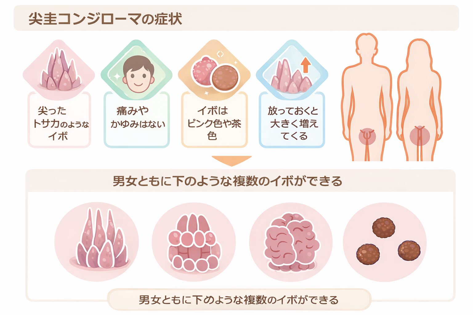 イボは乳頭状やカリフラワー状に盛り上がり、かゆみや違和感を伴う場合があります。