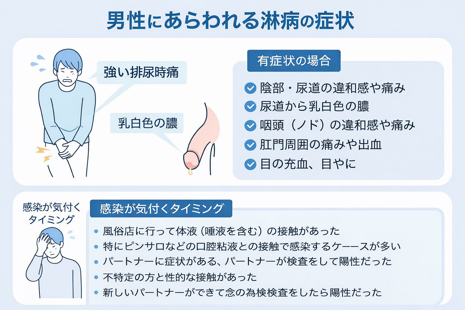 男性の場合は、強い排尿時痛と乳白色の膿の症状が目立つため、淋病を自身でも疑いやすいことが特徴です。